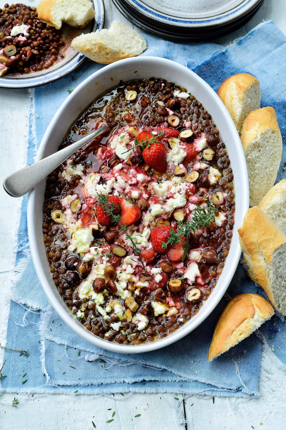 Doe de linzen op een bord en verkruimel er de feta over. Werk af met de gebakken aardbeien, twee eetlepels van de tijmolie en wat versgemalen peper. Serveer met wat stokbrood.