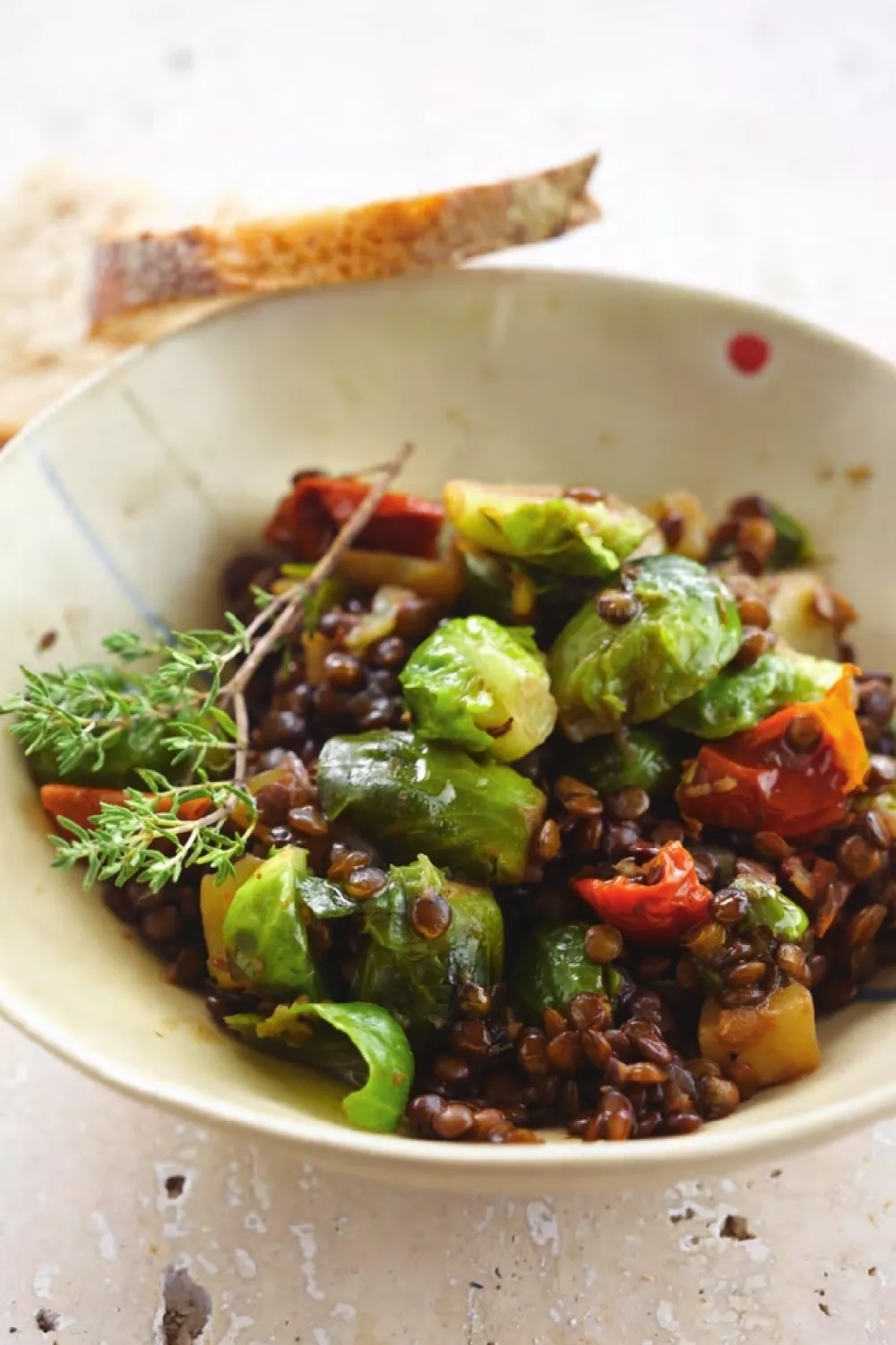 Voeg de linzen, gehalveerde spruiten, tijm, zongedroogde tomaten en de gedroogde kruiden toe. Giet er de groentebouillon bij en breng aan de kook. Verlaag het vuur en laat de linzen 15 minuten sudderen.