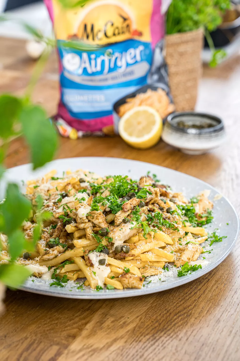 Knapperige loaded fries met stukjes gebraden kip, geraspte Parmezaanse kaas en een romige Caesarachtige saus met ansjovis en citroen voor een zoute frisse smaak. De frietjes worden snel krokant in de Airfryer en je maakt de saus zelf op basis van eigeel, mosterd en yoghurt voor extra body. Perfect als feestelijke borrelhap, shared comfort food of snelle weekavondmaaltijd in lente en zomer.