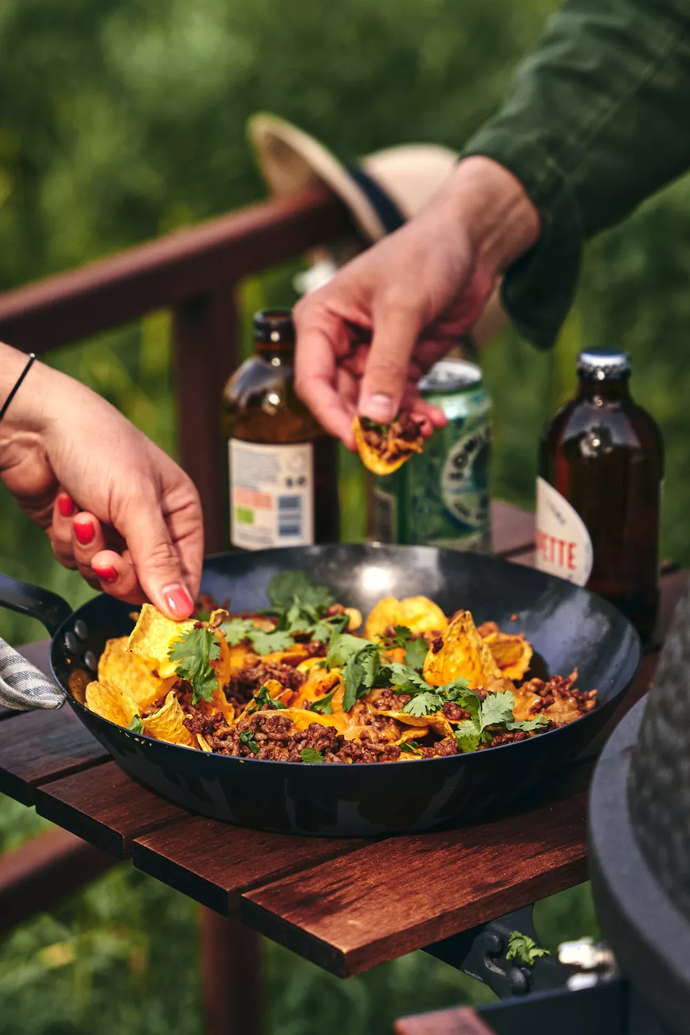 Doe in een barbecue- of ovenbestendige schaal een laag nacho’s, verdeel daartussen en eroverheen het gehakt en tot slot een royale hoeveelheid geraspte kaas. Zet dit terug op de barbecue (of in je voorverwarmde oven) en laat staan tot de kaas is gesmolten.