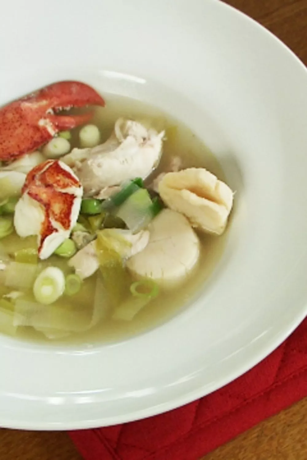 Een luxueuze twist op klassieke cock-a-leekie: een hartige kippenbouillon met prei, aardappelschijfjes en rijk kreeftenvlees, aangevuld met sint-jakobsschelpen en zachte pruimen. De kreeft wordt kort gegaard in opkookend water terwijl de kip een uur rustig suddert tot een volle, aromatische bouillon. Serveer warm als feestelijk voorgerecht of als verfijnd winters hoofdgerecht met frisse lente-ui erboven.