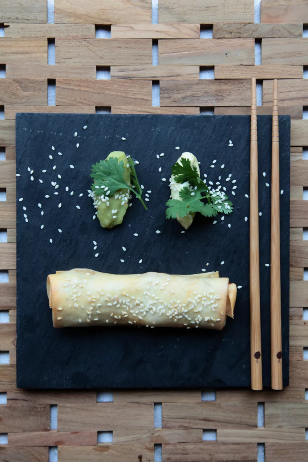 Deze krokante loempia met scampi en avocado brengt frisse citroenzeste, knoflook en een geurige sesamkorst samen. Je rolt de vulling in brickdeeg, bakt kort en frituurt tot goudbruin, om te dippen in een romige currymayonaise met yoghurt en madras. Afgewerkt met koriander is dit een heerlijk borrelhapje of feestelijk voorgerecht, ideaal voor lente en zomer met een vleugje Aziatische streetfoodsfeer.