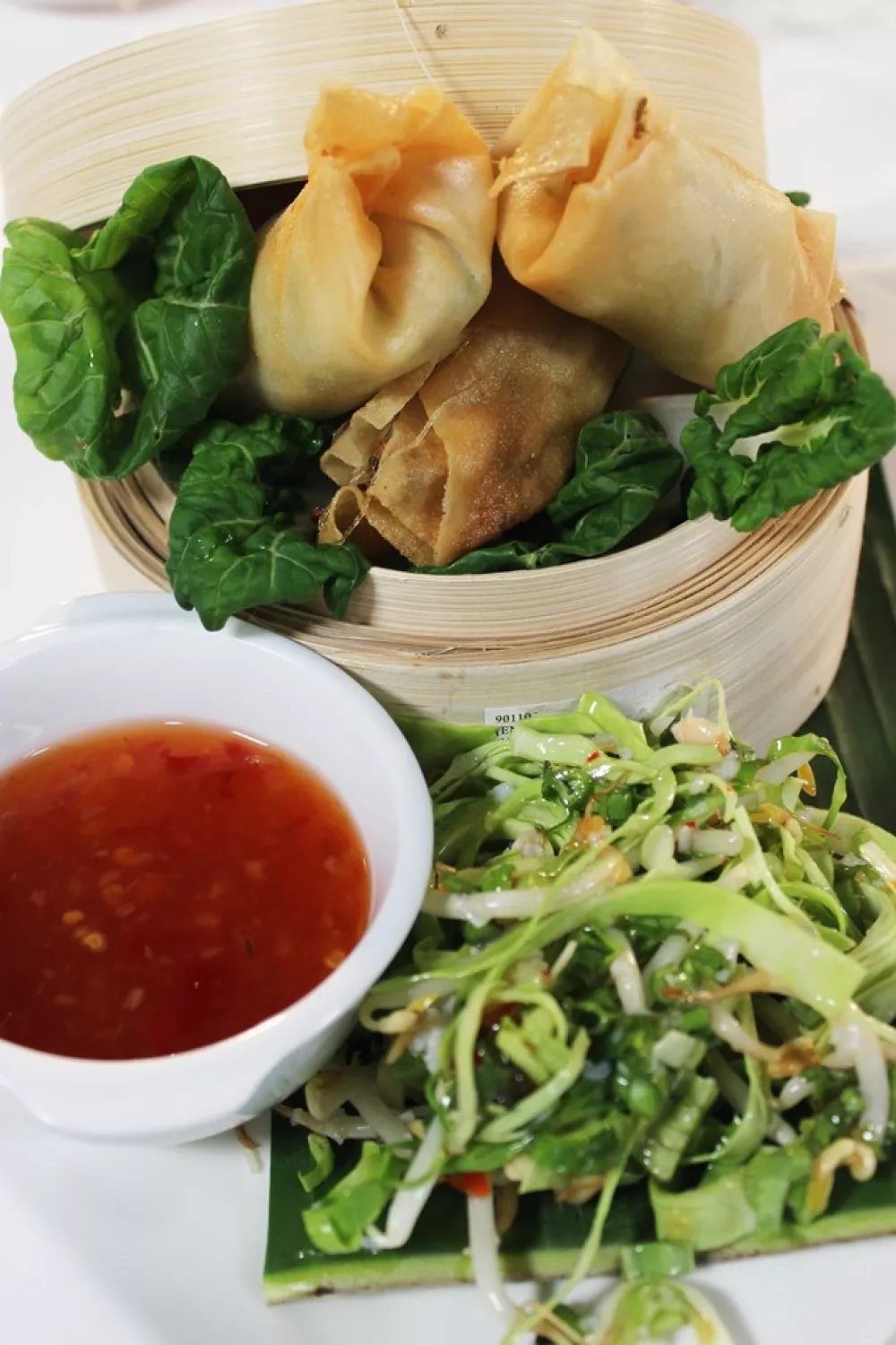 Serveer de loempia’s met het slaatje en zoetzure saus.