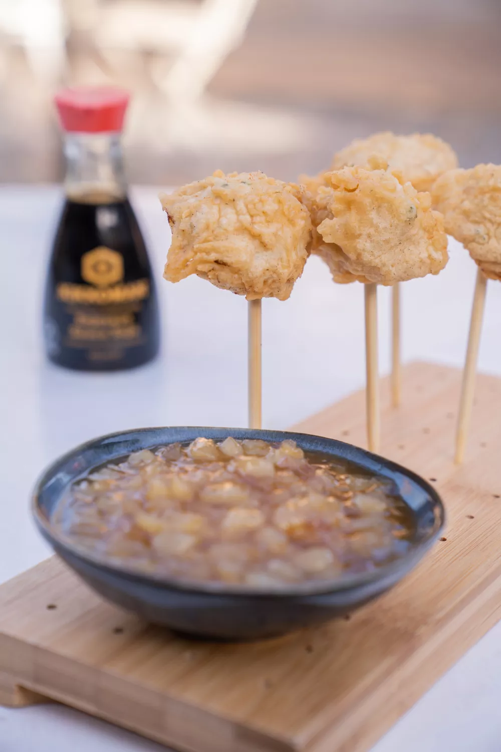 Steek de kippenbeignets op een stokje en serveer met de perenchutney om in te dippen.
