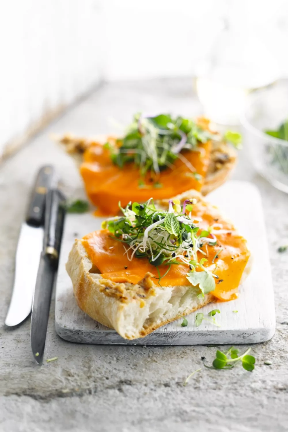 Snijd de ciabatta in grote stukken en bestrijk rijkelijk met boter en geroosterde lookpasta. Leg er twee sneetjes cheddar op en rooster in de oven tot de cheddar smelt.