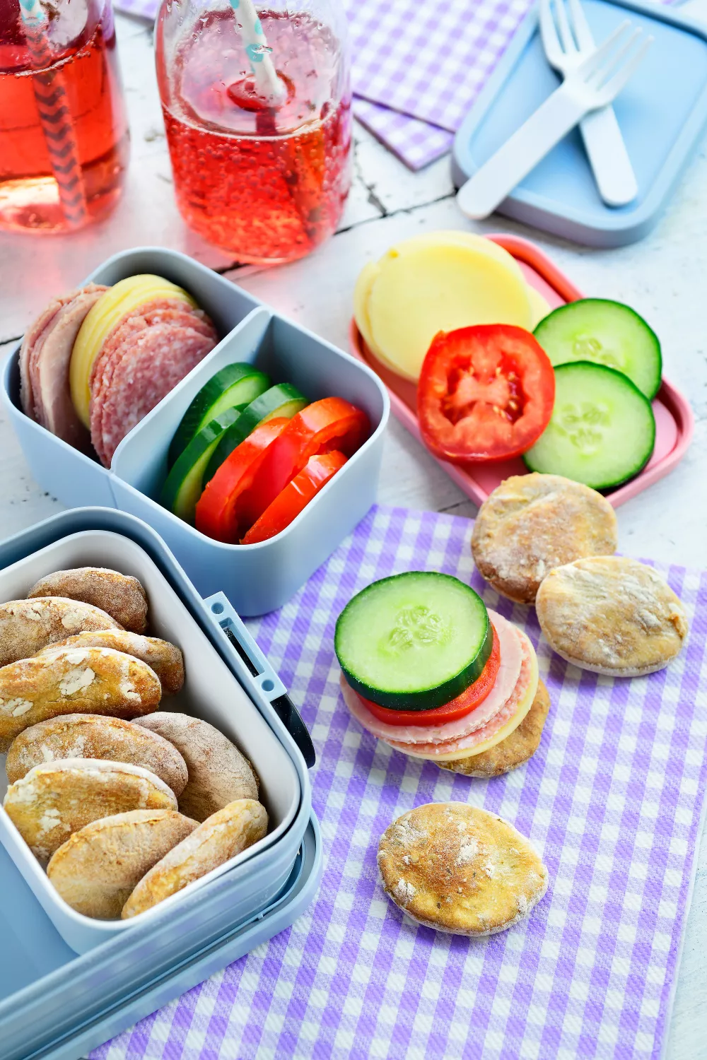 Stel je lunchbox samen. Leg alles per soort op een stapel en verdeel de stapels over je lunchbox. Tijdens de lunch kan je nu elke cracker beleggen met het beleg naar je keuze.