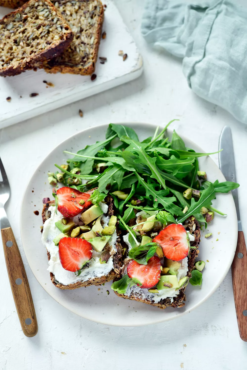 Een lichte zomerse lunchtoast met romige ricotta, rijpe avocado en frisse aardbeien is ideaal voor een snelle gezonde lunch of lichte brunch. Geroosterd meergranenbrood krijgt pit van knapperige pistachenootjes en peperige rucola, afgewerkt met olijfolie en balsamico voor een zoetzure balans. Snel te bereiden en kleurig gepresenteerd, perfect voor lente en zomerse maaltijden.