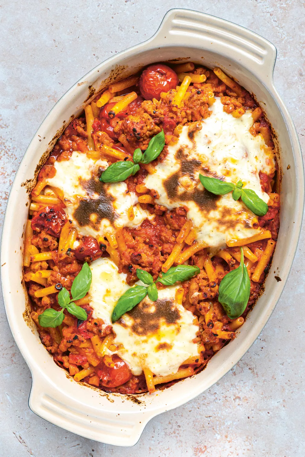 Meng de macaroni met de tomatensaus. Vul een ovenschaal met de helft van de macaroni, en verdeel er de helft van de bechamelsaus over. Schep dan de rest van de macaroni in de schaal en werk bovenaan af met de overgebleven bechamelsaus. Zet de macaroni met twee sauzen in de voorverwarmde oven en laat hem ongeveer 20 minuten bakken. Dien onmiddellijk op en werk af met enkele blaadjes basilicum.