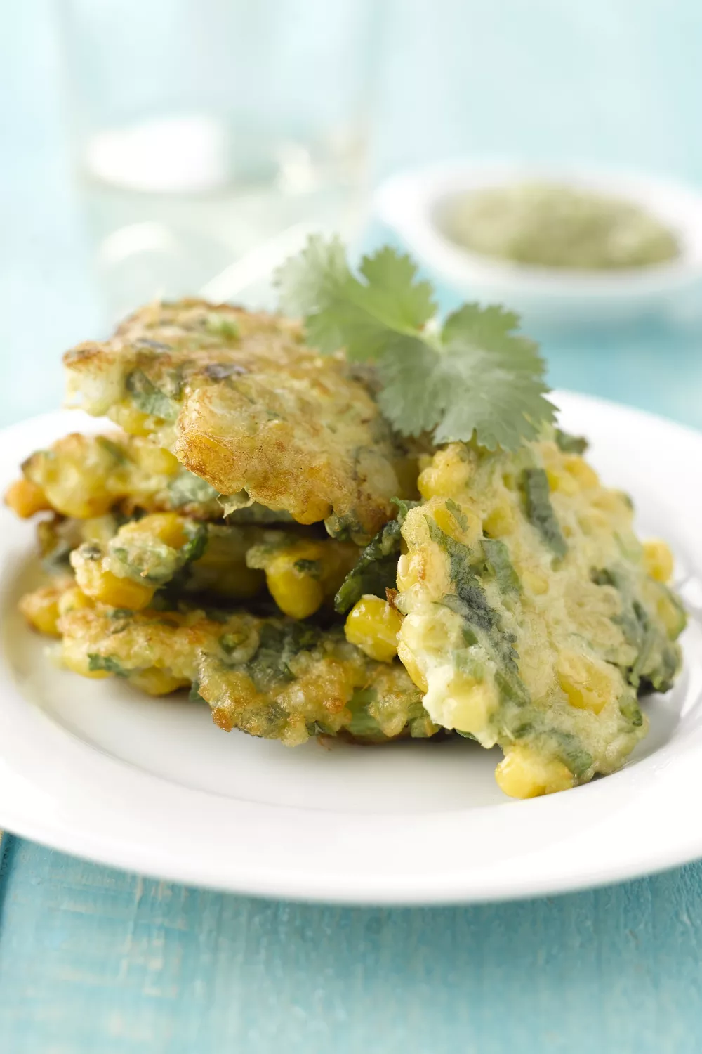 Knapperige maïskoekjes met zoete maïs, frisse koriander en een pittige touch van chilipepertjes en gember zijn perfect als zomerse snack of borrelhapje. Door ze kort in zonnebloemolie te bakken krijgen ze een goudbruin krokant korstje terwijl het hart zacht en sappig blijft dankzij de eieren en lente-ui. Snel en vegetarisch bereid, heerlijk als bijgerecht of fingerfood bij een Aziatisch geïnspireerde maaltijd.