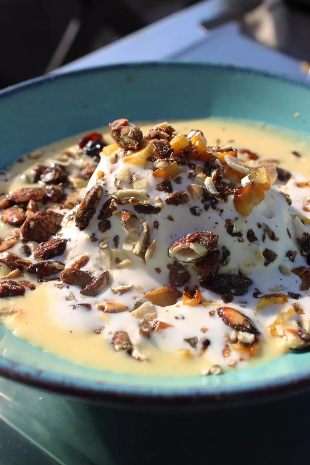 Schep de coulis van maïs in een kommetje en voeg een bol vanille-ijs toe. Haal de gekarameliseerde maïs van de grill en snij de maïskorreltjes er af. Strooi ze over het ijs en werk verder af met gekarameliseerde pompoenpitten.