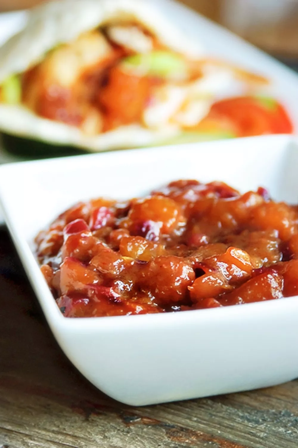 Als de chutney te droog wordt tijdens het koken voeg je kleine scheutjes water toe. Breng de chutney op smaak met zout.