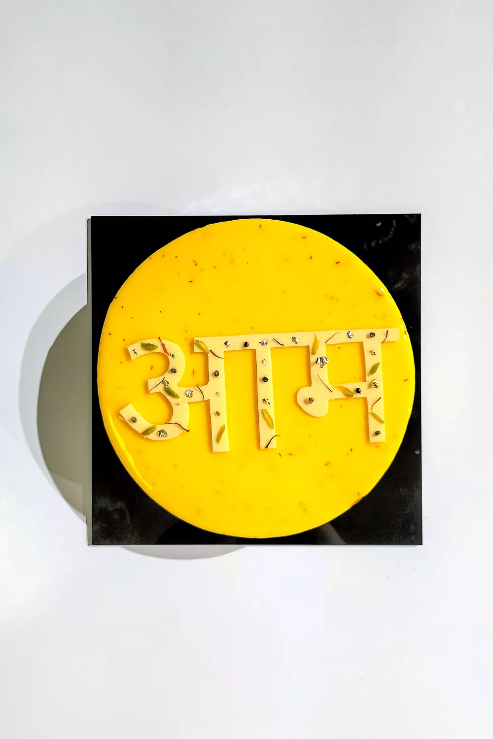 Print het woord mango in Hindi uit (15cm x 8cm). Knip het woord zorgvuldig uit. Verwarm 100 gram witte chocolade in de microgolf tot 45-50°C. Voeg nu beetje bij beetje nog 50 gram witte chocolade toe, roer continu. Laat de temperatuur zakken tot 28-29°C. Spreid de chocolade uit op een stuk acetaatfolie tot +- 3-5 mm dikte. Wanneer de chocolade begint op te stijven, kan je de stensil erop leggen. Belangrijk is dat je de stensil er omgekeerd oplegt, zo kan je de glanzende zijde gebruiken. Begin de contouren uit te snijden met een exacto mes. Laat de decoratie volledig opstijven voor je de acetaatfolie verwijdert. Werk het teken af met wat stukjes verse kardemom, saffraan, pistache en bladgoud.
