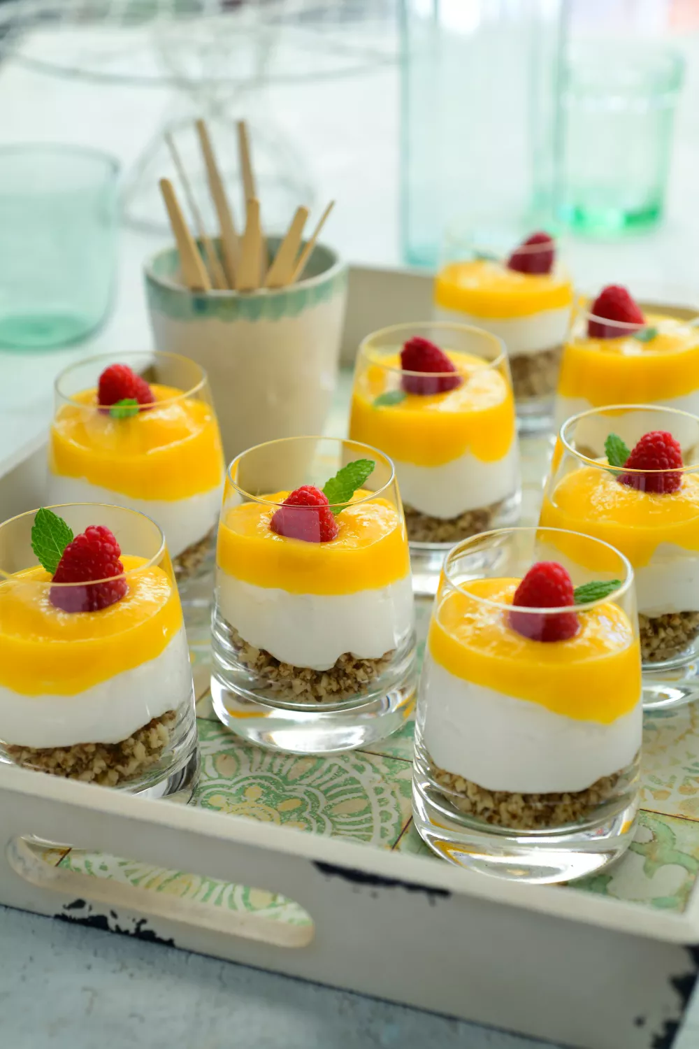 Mix met een staafmixer tot een coulis. Haal de spuitzak uit de koelkast en spuit de vulling op de amandelbodem tot ongeveer de helft van de glaasjes. Bedek de mousse met een laagje mangocoulis en werk af met frambozen of granaatappelpitjes en een blaadje verse munt.