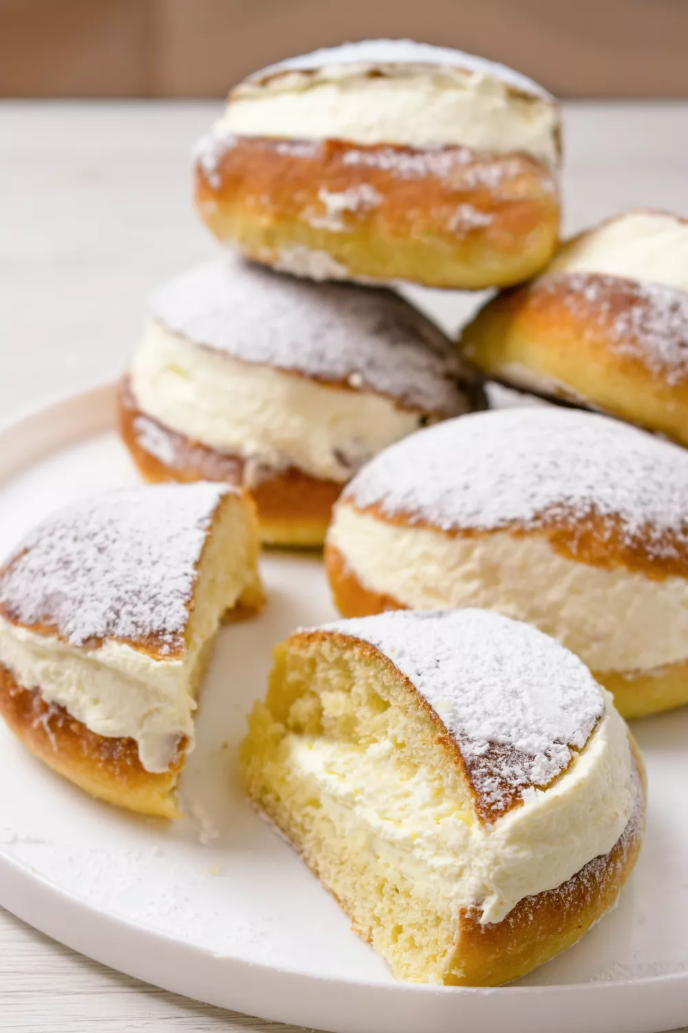 Wanneer de broodjes zijn afgekoeld, snij je ze open in het midden zonder het broodje helemaal door te snijden. Schep aan de hand van een lepel 2 à 3 lepels slagroom in het midden van ieder broodje en strijk de slagroom af aan de zijkanten. Strijk nu met een vloeiende beweging de room glad met de zijkant van een mes. Strooi optioneel wat fijngehakte pistaches over de slagroom alvorens te serveren.
