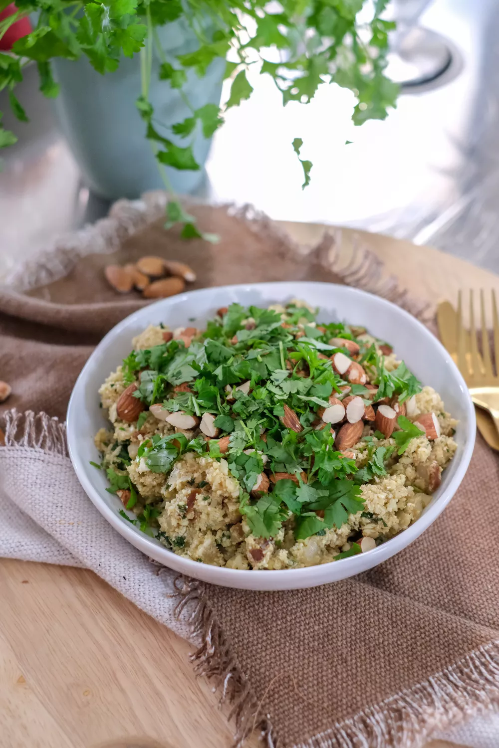 Marokkaanse bloemkoolcouscous met zoete dadels, geroosterde amandelen en frisse munt combineert warme specerijen en lichte texturen op je bord. De bloemkool wordt fijngemalen in de X Power Chopper en kort met komijn, kurkuma, kaneel en bouillon gesudderd, terwijl de amandelen geroosterd worden voor extra crunch. Een snelle vegetarische schotel die zowel doordeweeks als bij zonnige lente en zomeravonden goed past.
