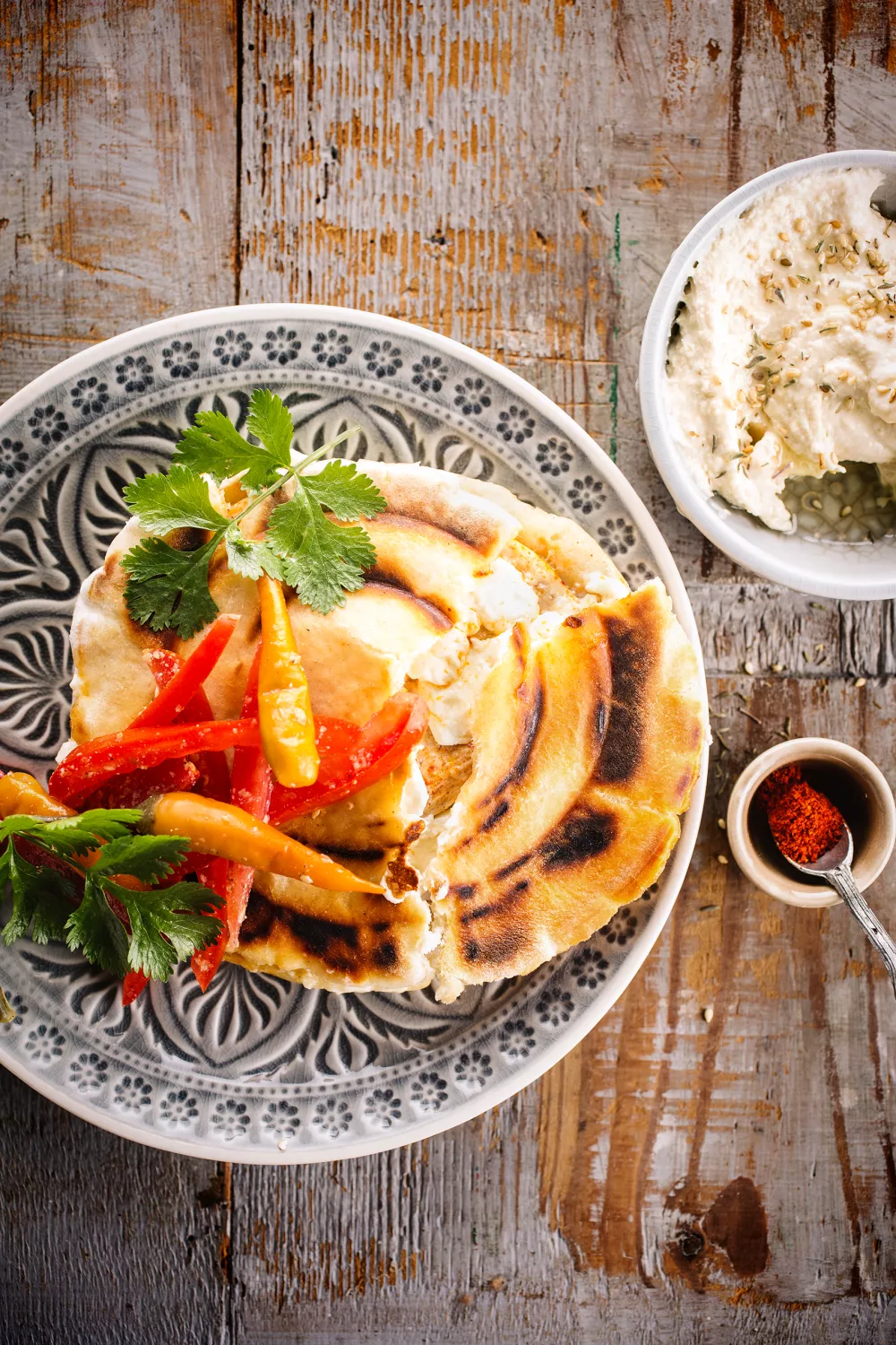 Verwarm het panini-apparaat voor. Snijd het pitabroodje doormidden. Snijd de kipfilet in flinterdunne plakjes, ze moeten garen in het panini-apparaat. Meng een koffielepel olijfolie met de ras-el-hanout, de kipkruiden en de harissa naar smaak. Marineer de plakjes kip in de olijfolie. Snijd de feta in plakjes. Beleg de onderste helft van het broodje met de kipfilet en de feta. Dek af met de bovenste helft van het broodje. Bestrijk het broodje langs beide kanten met olijfolie en leg in het croque-apparaat. Laat de croque mooi goudbruin kleuren. Zorg ervoor dat de kip goed gaar is. Neem de croque uit het apparaat. Serveer met hummus en een salade van reepjes tomaat en opgelegde pepers.