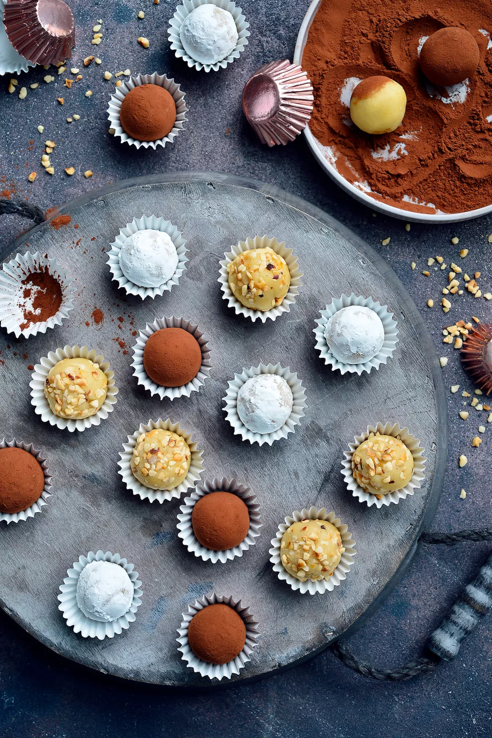 Rol balletjes van de marsepein en rol ze naar keuze door cacaopoeder, bloemsuiker of gehakte hazelnoten.