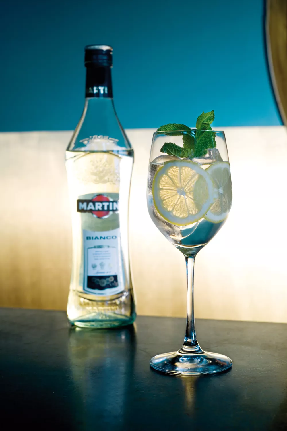 Neem een groot wijnglas met ijsblokjes, voeg de Martini Bianco toe, vul op met Martini Brut, roer even en garneer met citroenschijfjes en de munt.