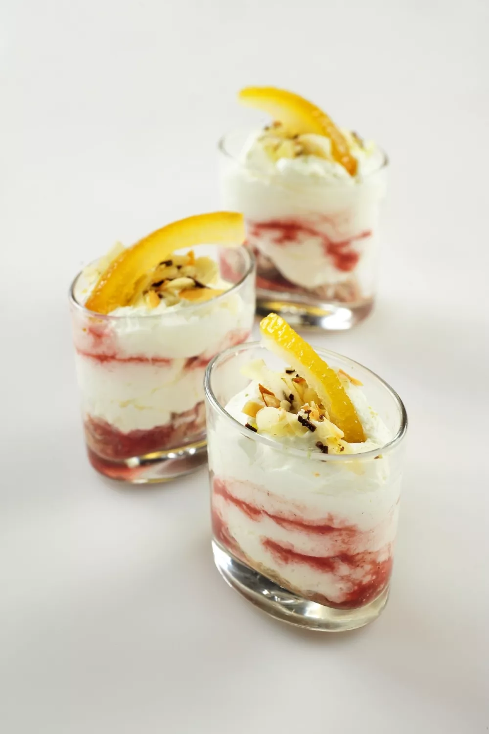 Werk de glaasjes af met geroosterde amandelen en een stukje gekonfijte sinaasappelschil.