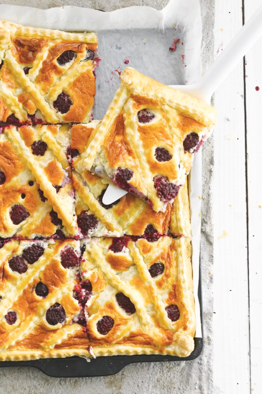 Een luchtige mascarponetaart met knapperig bladerdeeg en een frisse laag bramen en bosbessen, perfect als zomers dessert of feestelijk gebak. Romige mascarpone met vanillesuiker en opgeklopte eiwitten geeft een fluweelzachte vulling, die na blind bakken en afbakken mooi goudbruin en krokant wordt.