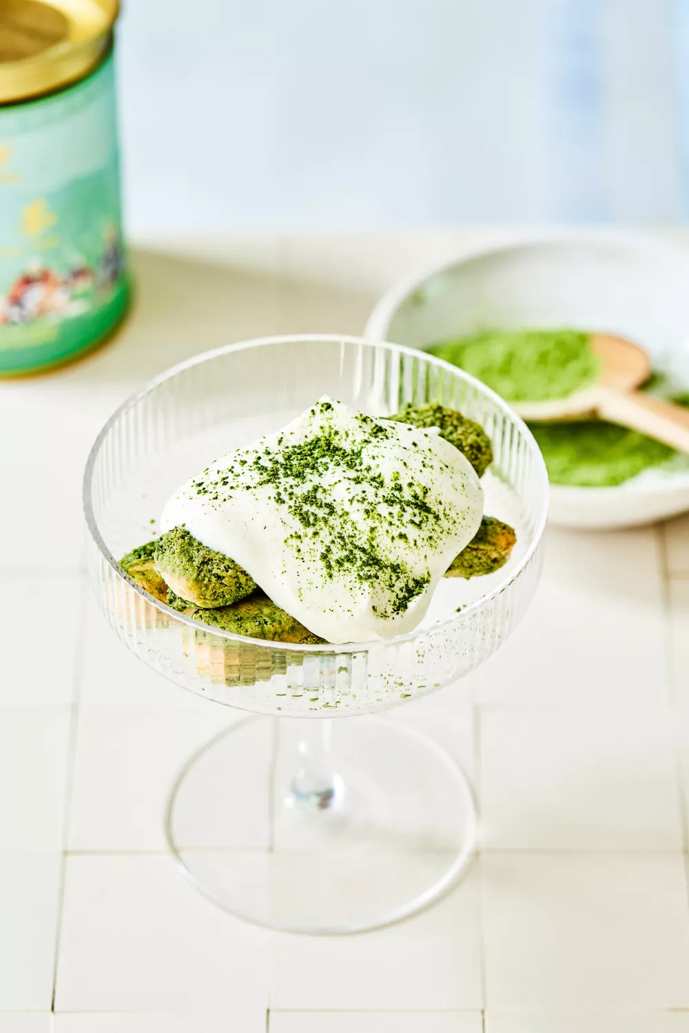 Verdeel de mousse over de boudoirs en werk af met matchapoeder.