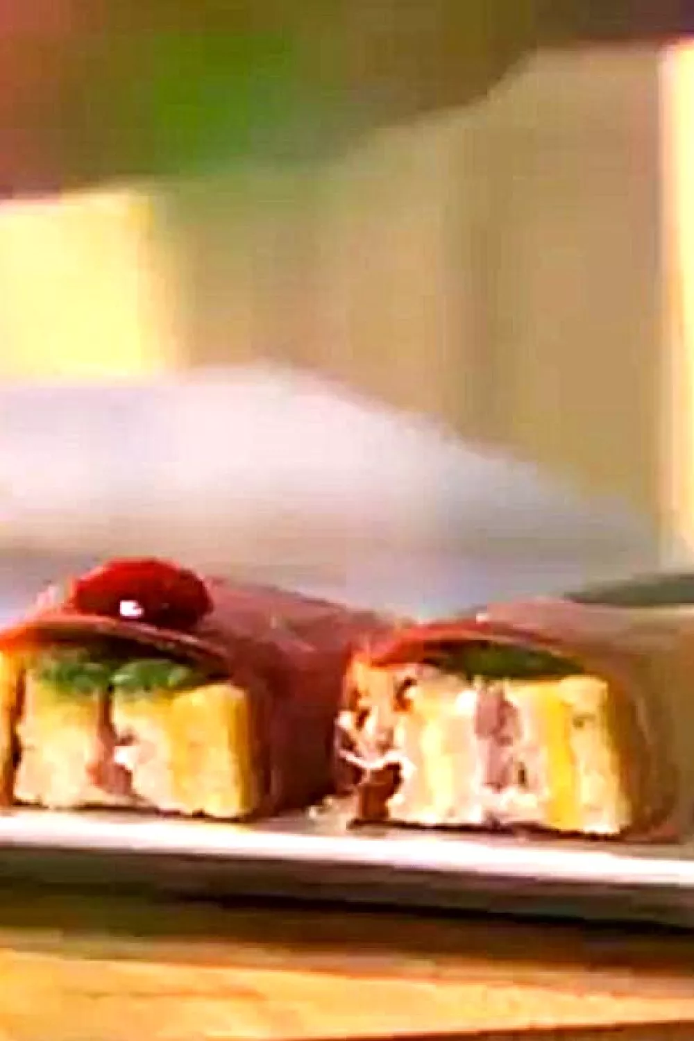 Haal de tosti uit de Philips Airfryer. Verwijder de korsten en snijd overlangs in 4 lange repen. Besmeer elke broodreep met de pesto en wikkel in een snede gedroogde ham.