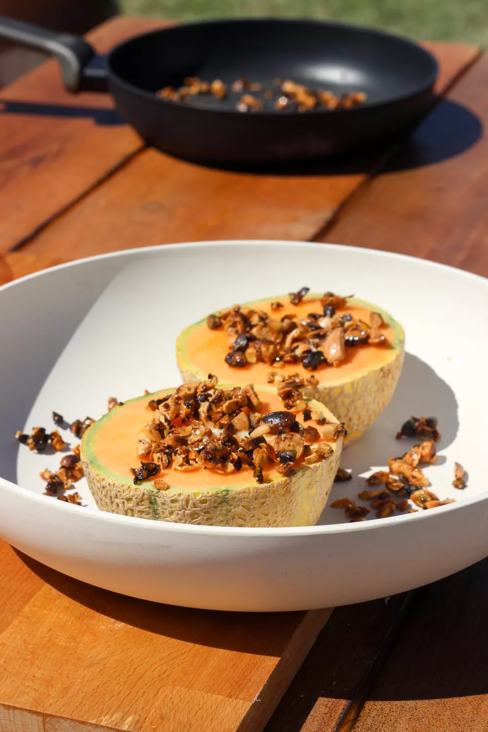 Haal de stukken meloen van de barbecue en schik ze mooi in een schaal. Strooi er de geroosterde nootjes over alvorens te serveren.