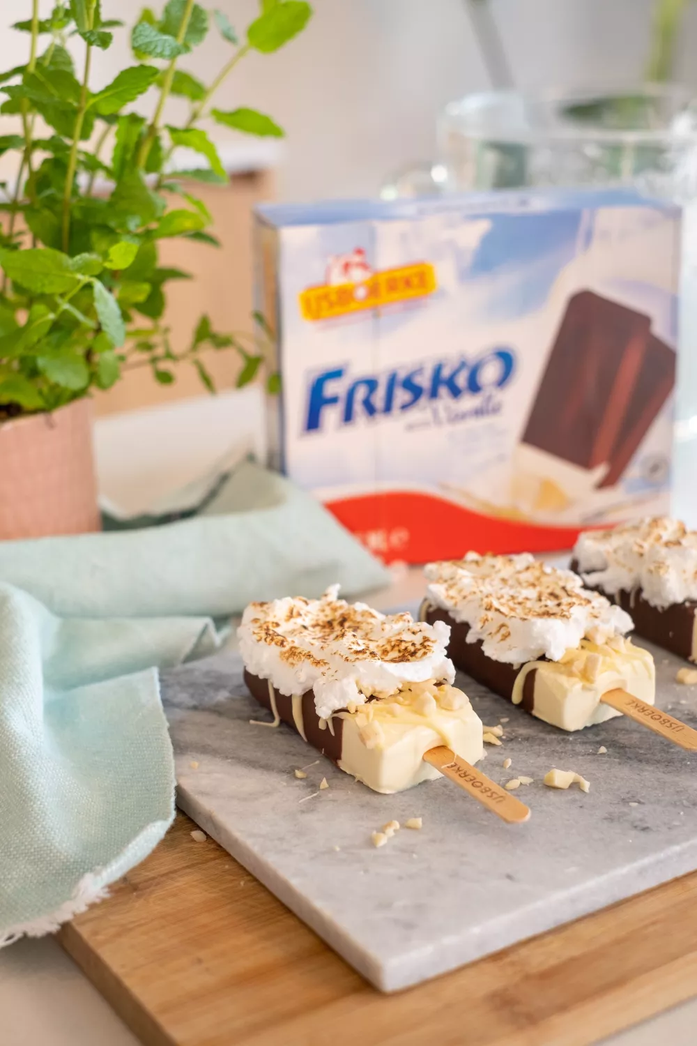 Besmeer de frisko's vervolgens met een laagje van de opgeklopte eiwitten en brand ze nog af met een keukenbrandertje alvorens te serveren.