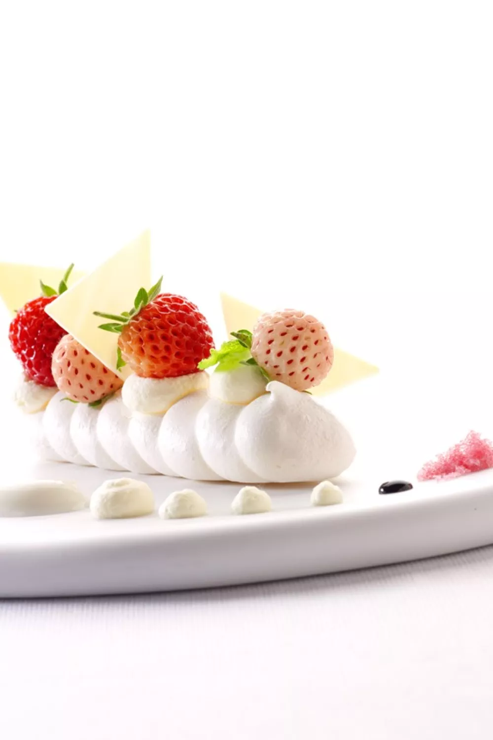 Leg voorzichtig enkele aardbeitjes op de meringue en voeg enkele toefjes slagroom toe. Werk verder af met muntblaadjes alvorens te serveren.