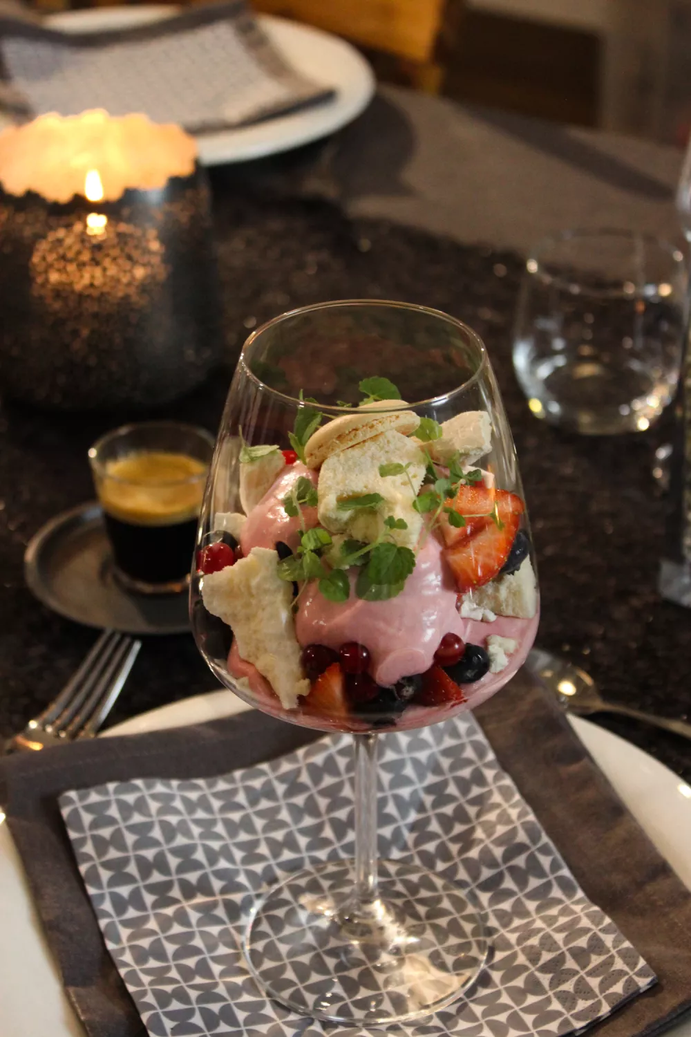 Neem grote wijnglazen en leg een laagje rode vruchten op de bodem. Verkruimel daar bovenop de meringue en spuit er een laagje van de mascarponecrème op. Herhaal tot het glas vol is. Werk af met atsina cress.