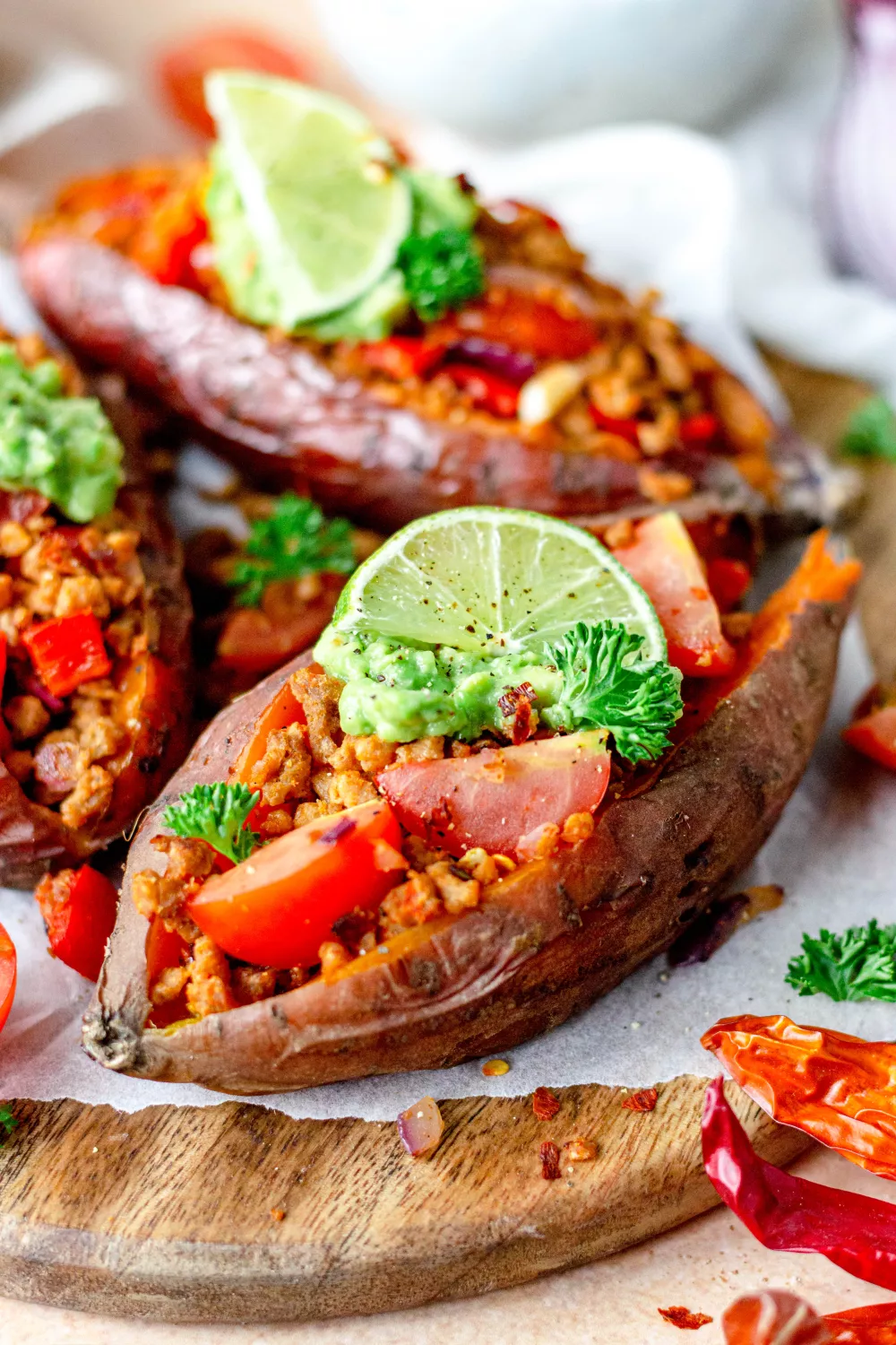 Deze Mexicaanse gevulde zoete aardappel is een kleurrijk en vullend hoofdgerecht boordevol smaken van gerookte paprikapoeder, limoen en verse koriander. De zoete aardappels worden langzaam geroosterd in de oven tot ze zacht zijn en vervolgens gevuld met gekruid vegetarisch gehakt, paprika en cherrytomaatjes, afgewerkt met haver fraiche en avocado. Ideaal voor een gezonde doordeweekse maaltijd of een gezellig vega etentje met vrienden.