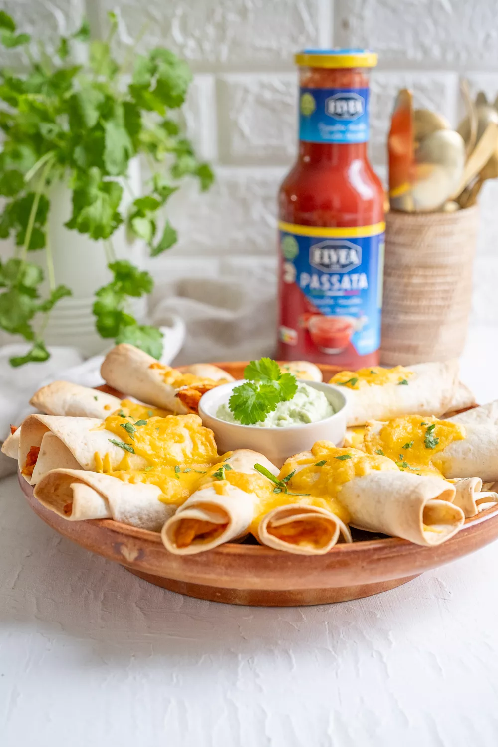 Deze Mexicaanse dipring brengt warme, licht pittige kip samen met romige avocado en gesmolten cheddar tot een feestelijke borrelhap of gezellige familielunch. Opgerolde tortillawraps gevuld met passata en kip worden in de oven goudbruin gebakken en rond een kom met zure room en avocado gerangschikt om samen te dippen. Werk af met verse koriander voor een frisse touch; perfect voor feestjes, weekendavonden of zomerse bijeenkomsten.