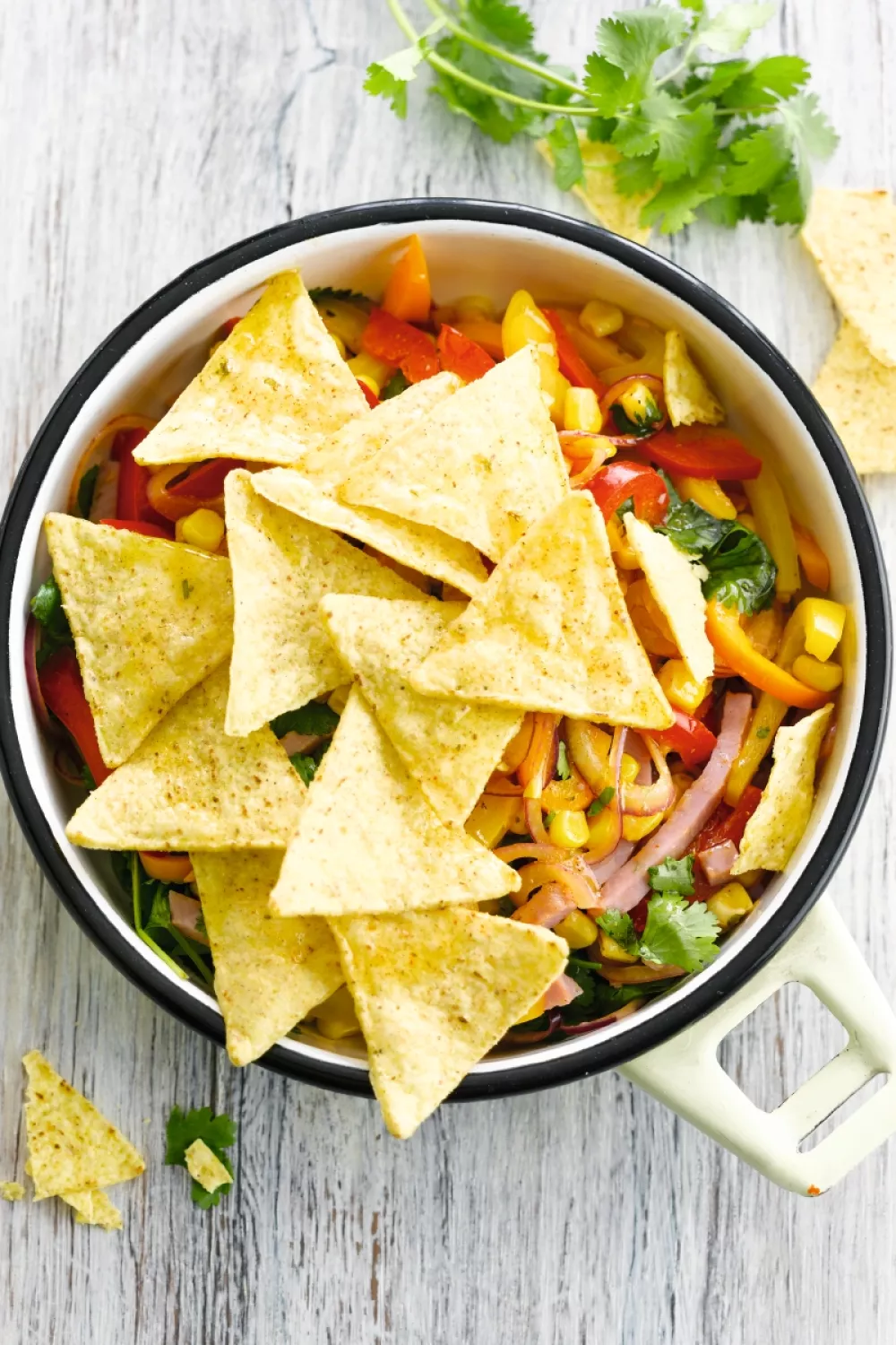 Knapperige Mexicaanse hamsalade met tortillachips vol zoete maïs, kleurrijke paprika's en frisse koriander. Kort gebakken ui en knoflook met cajunkruiden en een scheutje tabasco geven deze pittige salade een rokerige, zinderende smaak. Perfect als lichte lunch, borrelhap of zomerse picknick en makkelijk in een pan klaar te maken.