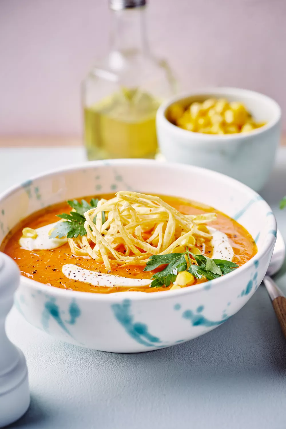 Deze romige Mexicaanse wortelsoep brengt zoete wortelen en gepelde tomaten samen met pittige chilipoeder en warme komijn voor een rijke, troostrijke smaak. Afgewerkt met maïs, een lepeltje kokosroom, ringetjes lenteui en knapperige tortillareepjes is het perfect voor een snelle lunch of verwarmend herfst- en wintergerecht. Stoof de wortelen, pureer tot glad en bak de tortilla’s voor extra textuur.