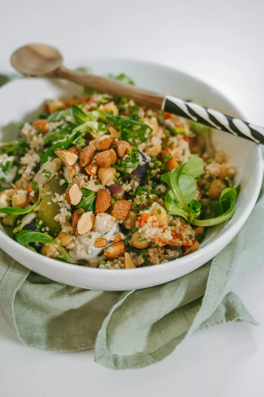 Een oosterse couscoussalade met romige tahindressing, volkoren couscous en eiwitrijke kikkererwten, aangevuld met geroosterde paprika, wortel, witte kool en rode ui. De groenten worden in de oven goudbruin geroosterd, daarna op smaak gebracht met komijn en kaneel en afgemaakt met verse bieslook en knapperige amandelen. Licht en voedzaam, perfect als doordeweekse lunch, bijgerecht bij een barbecue of voor een zomerse picknick.