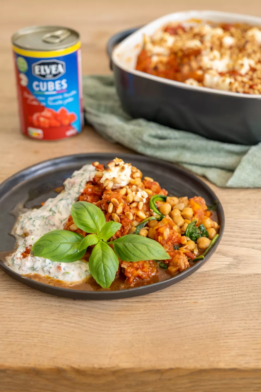 Deze Midden Oosterse ovenschotel combineert langzaam gestoofde ragu van varkens en rundsgehakt met tomatensaus, harissa en romige ricotta voor een volle, verwarmende smaak. Kruidige kikkererwten met za'atar, komijn en chilipoeder geven textuur en pit, terwijl verse salie, rozemarijn en citroentijm voor een aromatische toets zorgen. Ideaal als comfort food voor een gezellig familiediner of een herfstig weekendmaal.