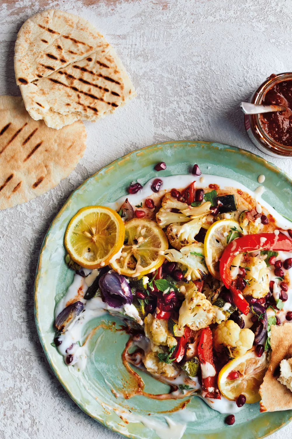Zachte geroosterde bloemkool, courgette en paprika krijgen een pittige, bloemige twist dankzij rozenharissa en romige tahin, afgewerkt met frisse munt en knapperige granaatappelpitjes. Deze traybake uit de oven op een bedje van plantaardige yoghurt met warme pitabroodjes is perfect voor een snelle doordeweekse maaltijd of een kleurrijk zomerbuffet. Alles op één bakplaat, 30 minuten roosteren en klaar om te delen.