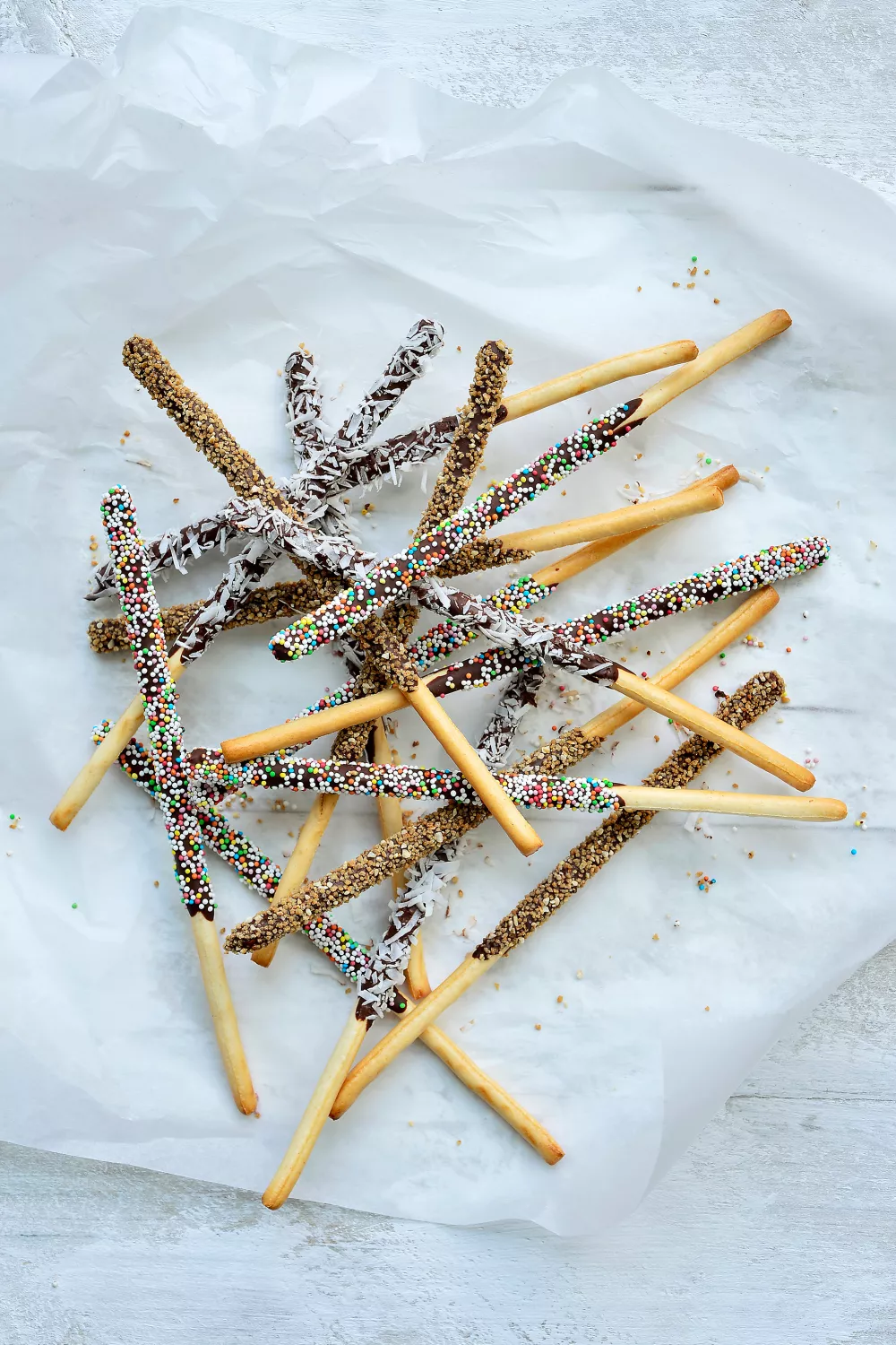 Smelt de chocolade met een scheutje water. Smeer de grissinistokjes in met een laagje chocolade en bestrooi met versiering naar keuze.