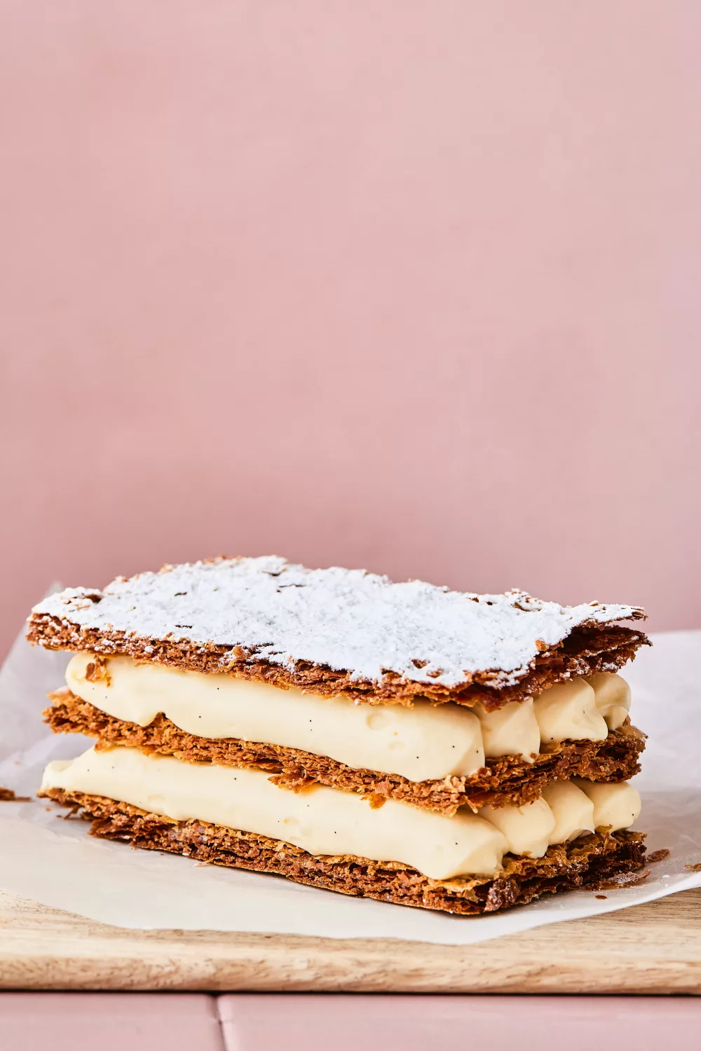 Knapperig bladerdeeg en fluweelzachte crème pâtissière vormen dit klassieke Franse dessert, perfect als feestelijk gebak of bij de koffie. Met kant en klaar bladerdeeg, melk, room, eidooiers en maïzena rol je dunne plakjes, prik je ze en bak je ze mooi plat tussen bakpapier en een tweede bakplaat. Spuit drie lagen romige custard op elkaar en werk af met poedersuiker voor een elegante, frisse touch.