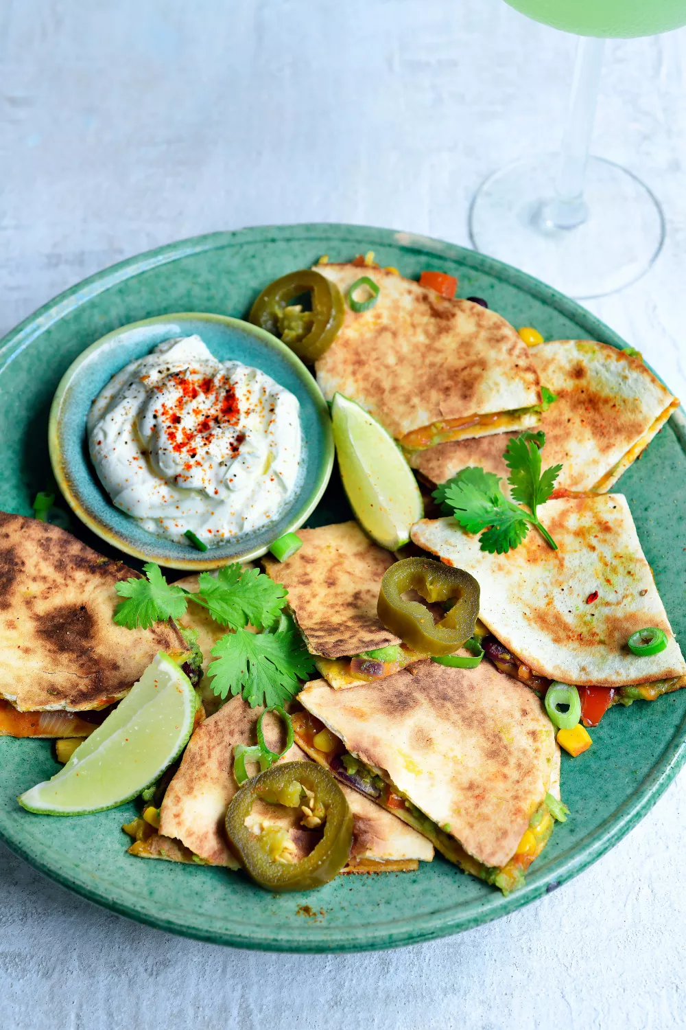 Mini quesadilla's met romige avocadopuree, zwarte bonen, mais en gesmolten cheddarkaas zijn een onweerstaanbare vegetarische borrelsnack voor een feestje of een zwoele zomerse avond. De groentesalsa wordt zacht gestoofd en de kleine tortilla's goudbruin en krokant gebakken in de pan. Serveer met zure room, koriander en limoen voor een frisse touch.