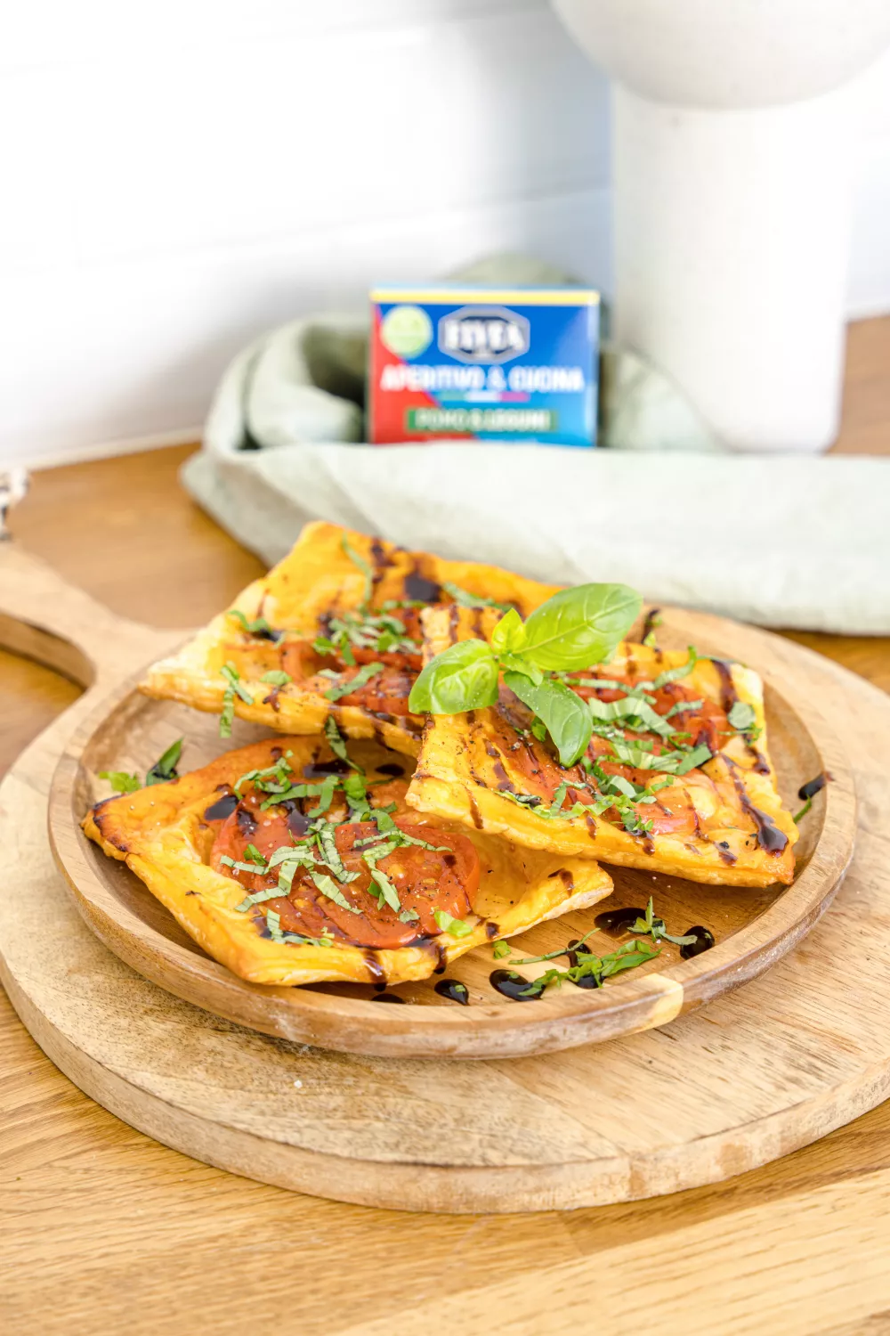 Knapperige mini tarte tatins met zoetzure tomaat en romige mozzarella, afgemaakt met Pomo e Legumi en een vleugje balsamicosiroop. Het bladerdeeg wordt losjes over de tomaat en kaas gedrapeerd en in de oven gebakken tot goudbruin, een ideaal borrelhapje of zomers voorgerecht met mediterrane smaken. Werk af met verse basilicum, peper, zout en een scheutje olijfolie voor een snelle en smaakvolle traktatie.