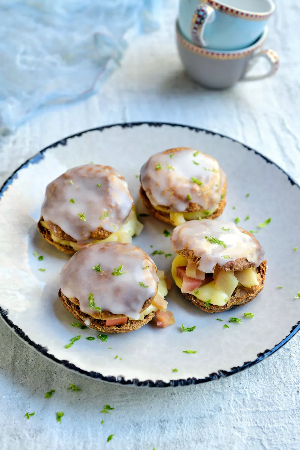 Bouw nu de taartjes. Snij met een gekarteld mes voorzichtig de bladerdeegrondjes horizontaal doormidden. Verdeel wat glazuur over de bovenste helften en laat in de de koelkast een minuut of vijf uitharden. Lepel op de onderkant wat gebakken appeltjes. Spuit er een toef pudding bovenop. Bedek met het glazuurdeksel. Werk af met zeste van limoen.