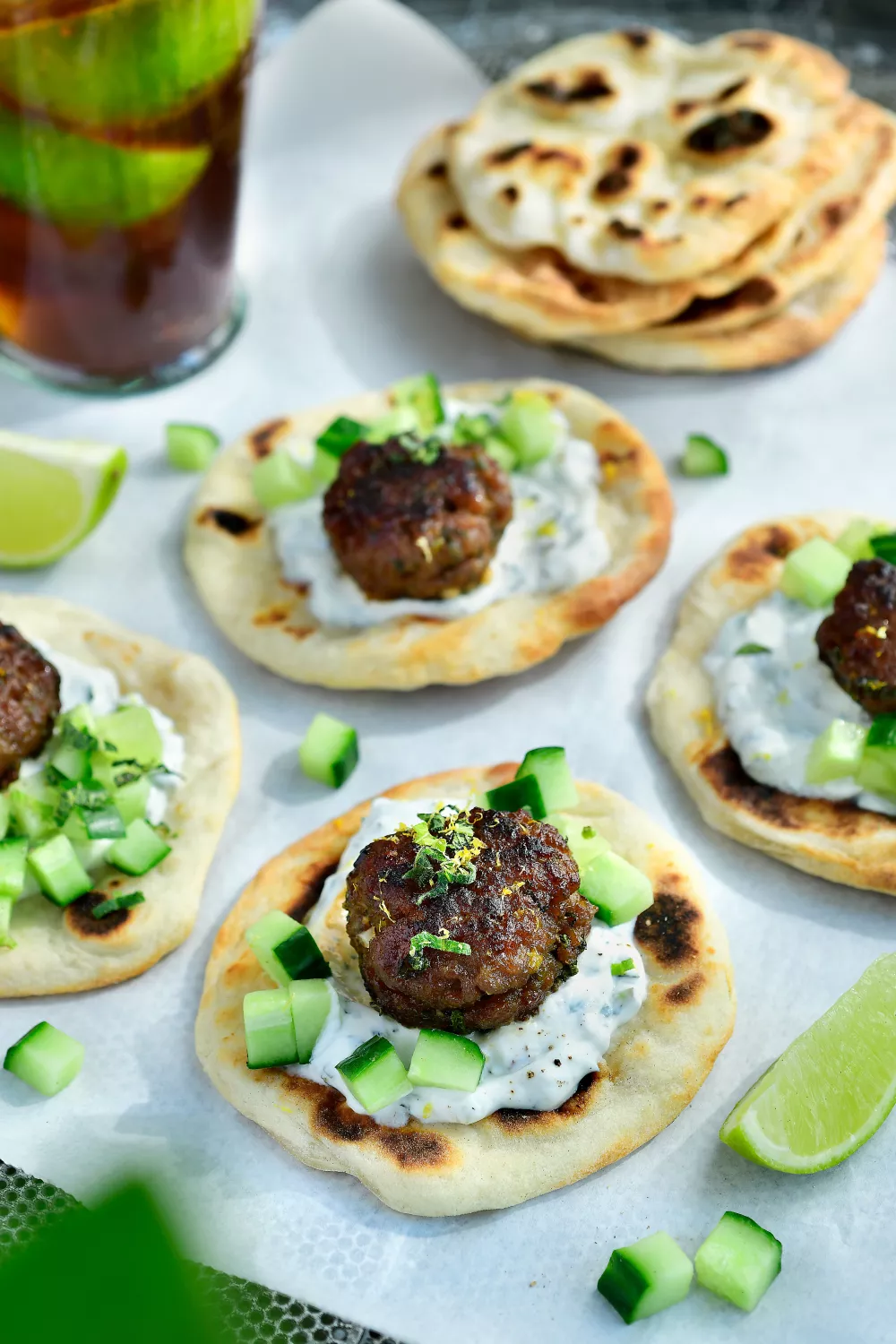 Mini pita's gevuld met sappige lamsgehaktballetjes, romige Griekse yoghurt en frisse komkommer brengen een Mediterrane toets aan je borrel of zomerse avond. De pitabroodjes maak je eenvoudig zelf van yoghurt en zelfrijzend bakmeel, de balletjes bak je in de pan met munt, harissa en komijn voor extra smaak. Met een finish van munt en citroenzeste zijn ze feestelijk en verfrissend.