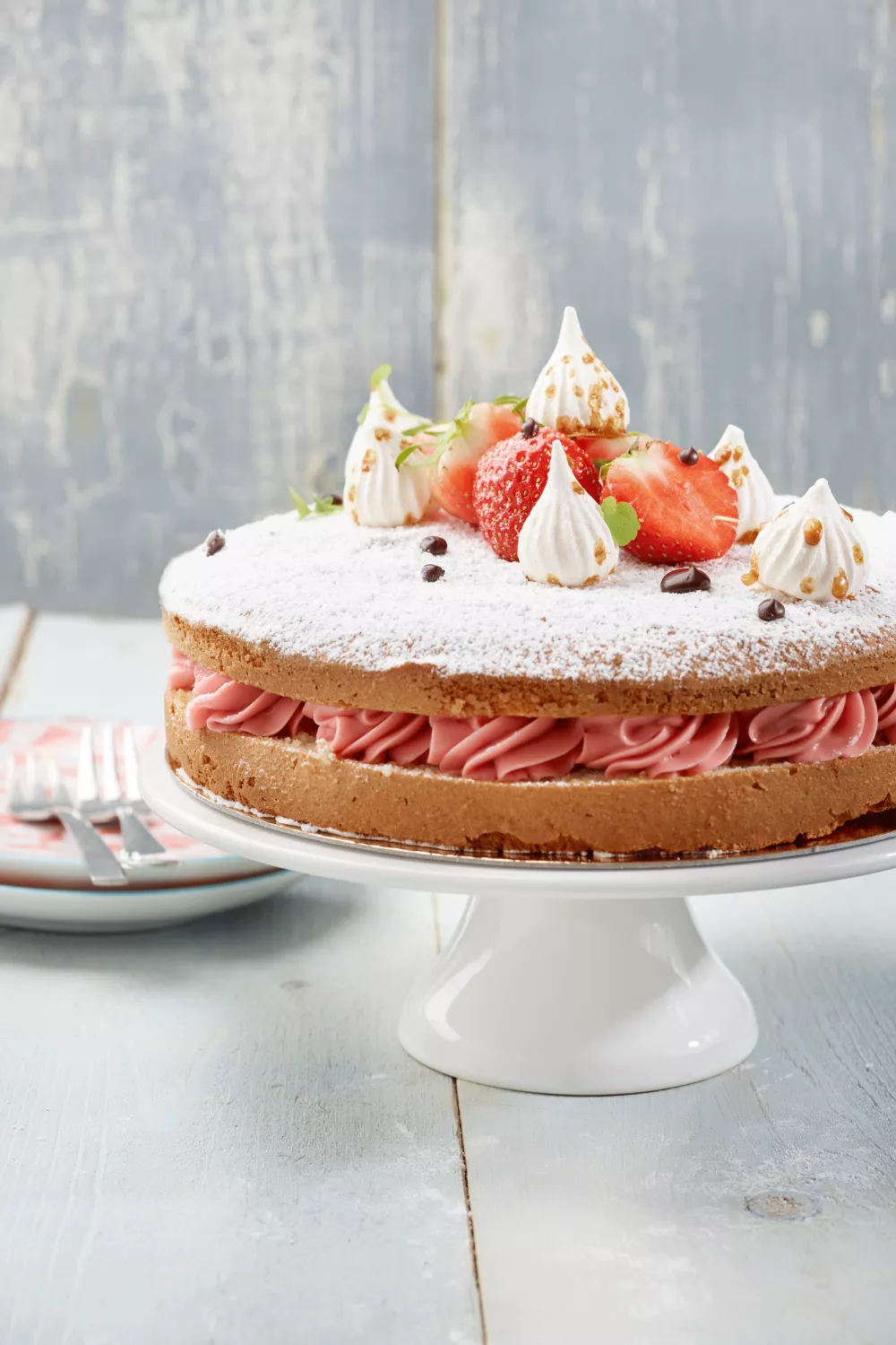 Snij de biscuit overlangs in twee met een kartelmes of een zaagmes. Maak met de spuitzak mooie torentjes van botercrème op de onderste laag van de biscuit. Leg er voorzichtig, zonder te drukken, de tweede schijf biscuit op. Bestrooi met bloemsuiker. Versier met enkele toefjes gebakken meringue en de doormidden gesneden aardbeien. Werk af met atsina- of zoethoutcress.