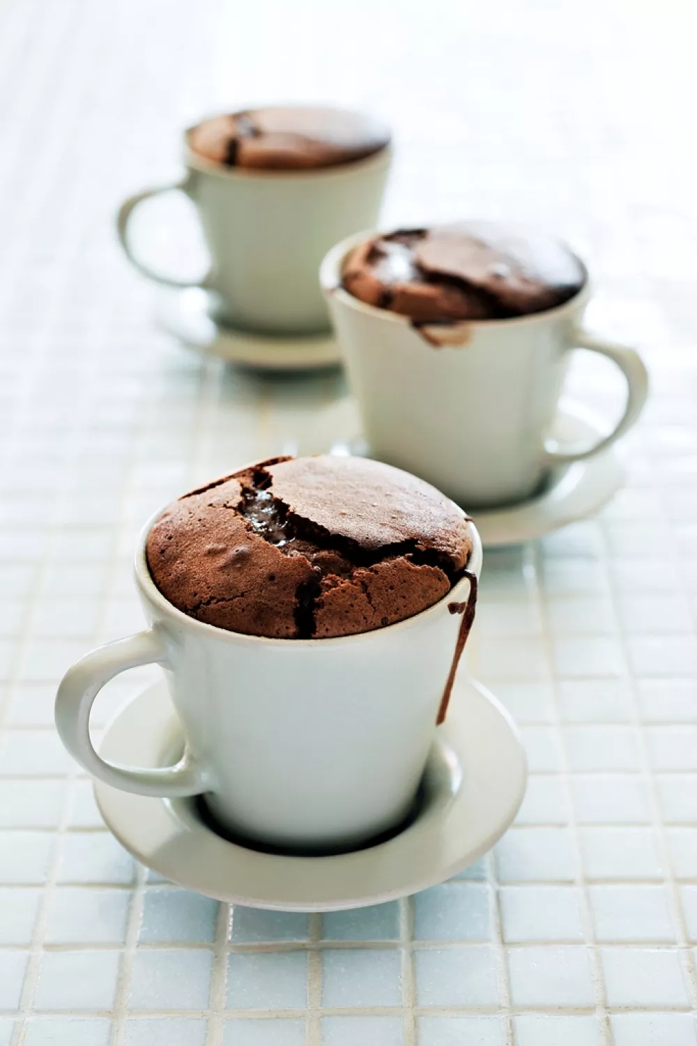 Vul de kopjes met het chocolademengsel en zet de ovenschaal 9 minuten in de oven. Eens klaar zet je elk kopje op een schoteltje en kun je het geheel meteen presenteren.