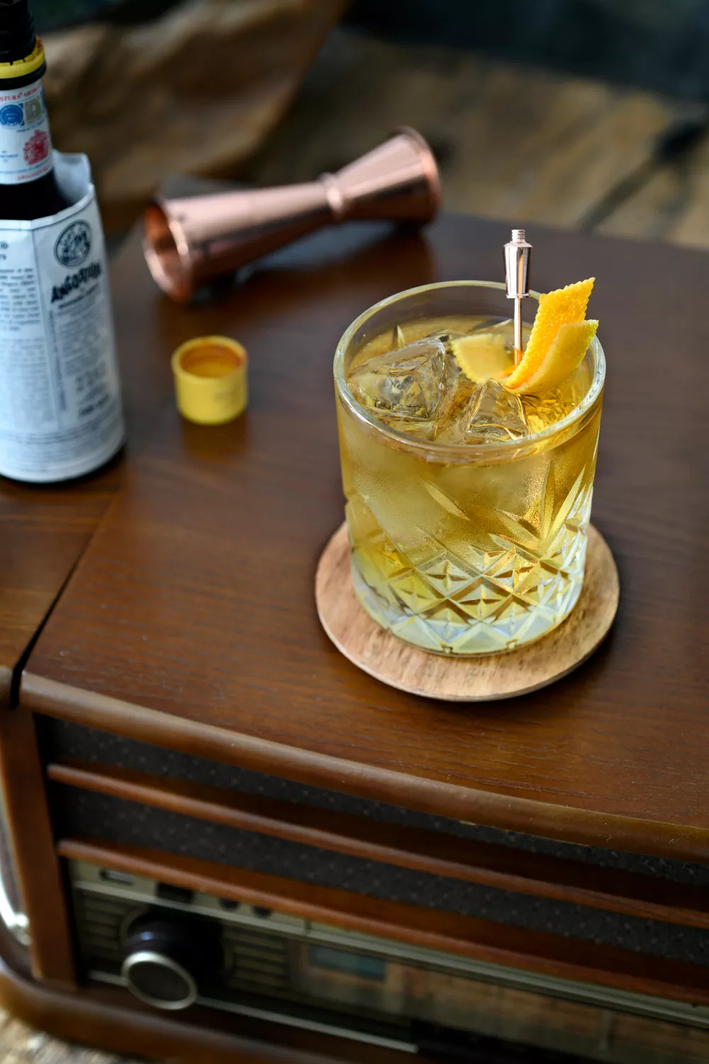 Zeef de cocktail in een 'Old Fashioned'-glas en garneer met een zeste van citroen en/of sinaasappel.
