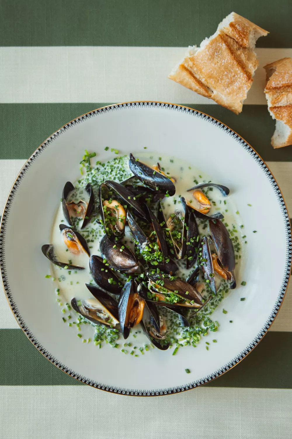 Serveer de mosselen met de saus in een diep bord, top af met een giga lading bieslook en eet op met je stokbrood.