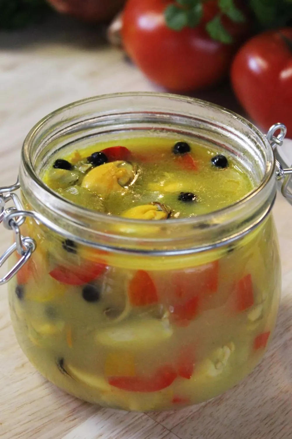 Schep de mosselen nu in glazen potjes en zet ze onder in de jus. Laat de potjes afkoelen alvorens ze afgedekt te bewaren in de koelkast.