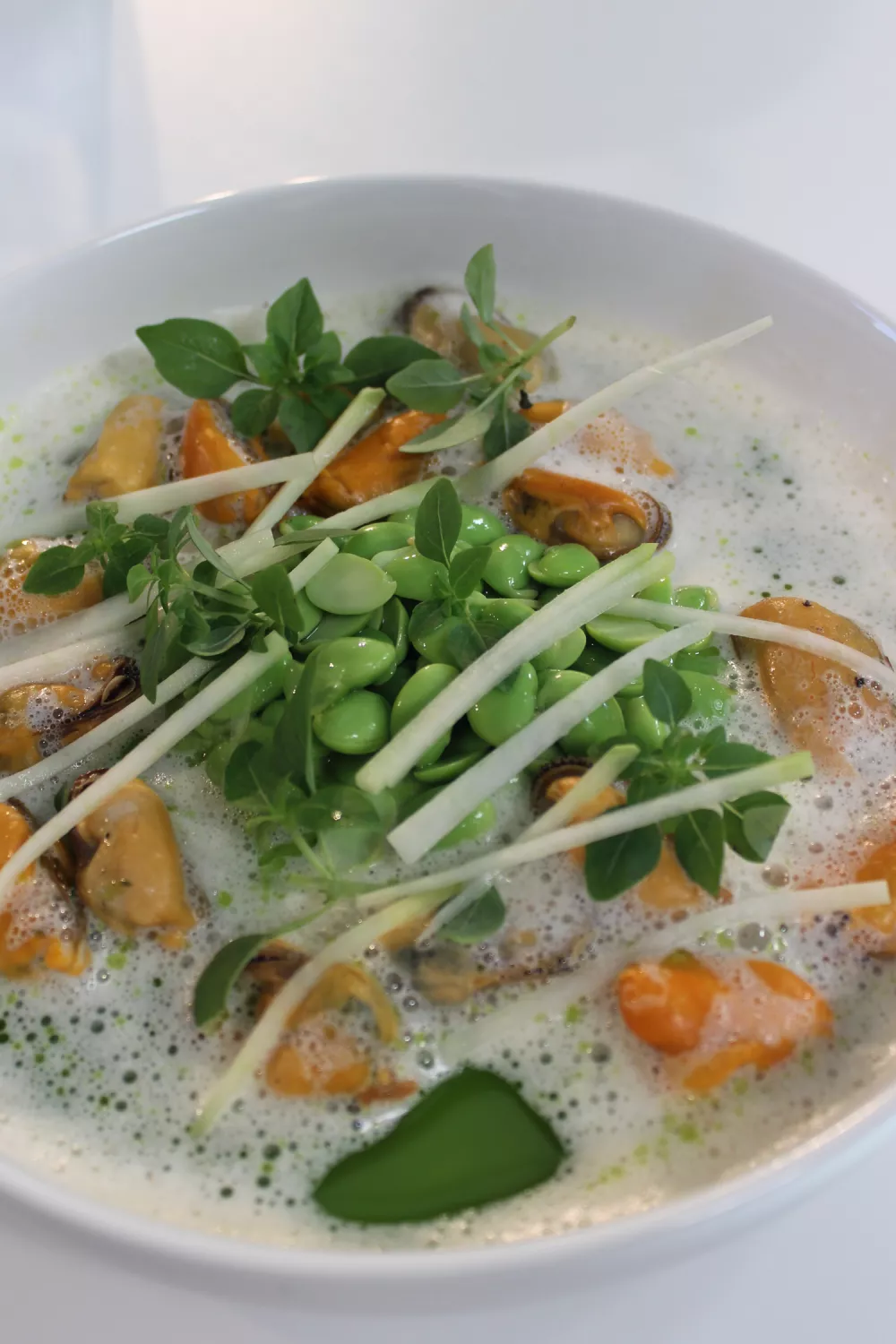 Frisse mosselen op een romige erwtenpuree, afgemaakt met aromatische steranijsboter en een pittig karnemelksausje. De mosselen worden kort gestoomd, de boter lichtbruin gebakken en de koriander geblancheerd voor een heldere kruidenolie, terwijl sojaboontjes en knapperige julienne koolrabi textuur toevoegen. Perfect als lichte zomerse maaltijd of feestelijk voorgerecht voor liefhebbers van zeevruchten en moderne, smaakvolle keuken.