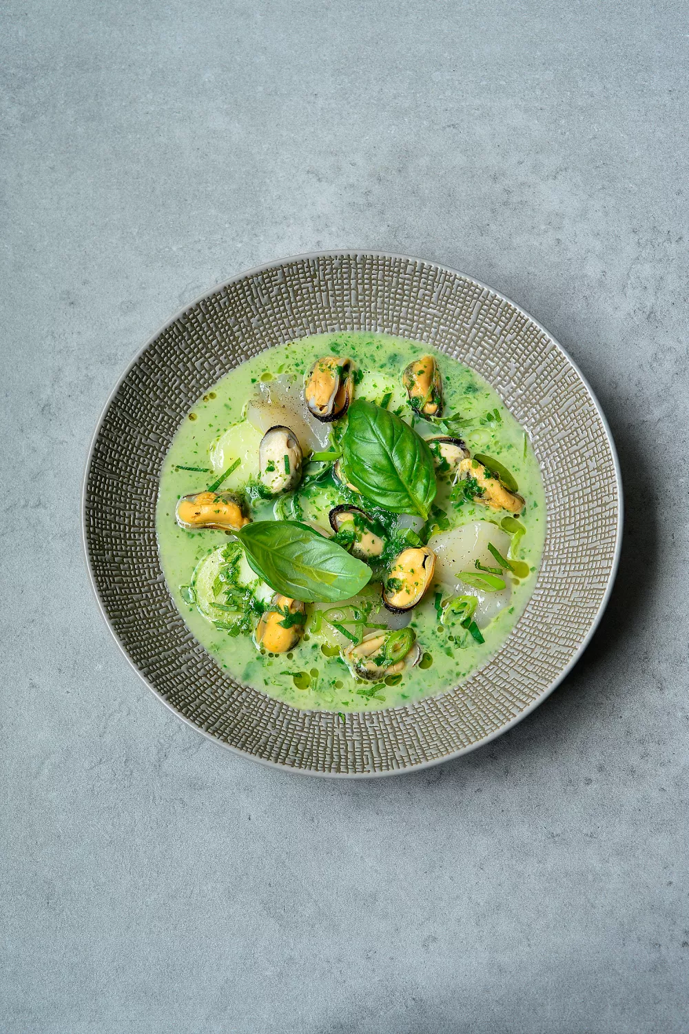 Een zijdezachte mosselsoep met een pittige toets van mierikswortel en een romige textuur door geblende spinazie en boter, geserveerd met dunne plakjes coquille en zachte aardappelrondjes. De schuimige bouillon benadrukt de zilte smaak van de schelpdieren. Ideaal als verfijnd zeevruchtenvoorgerecht bij een gezellig diner of koude herfstavond.